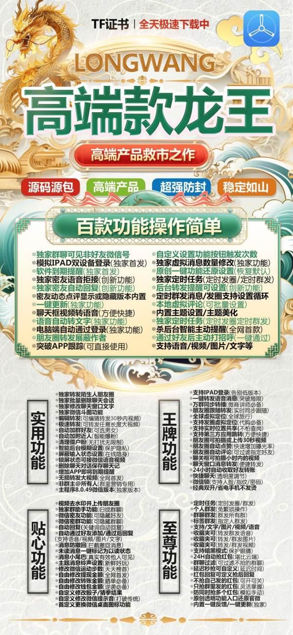 在当今的数字化时代,微信已成为人们日常生活中不可或缺的社交工具。然而,对于需要管理多个微信账号的用户来说,频繁切换账号无疑增加了使用难度和不便。为此,苹果龙王微信微信多开软件应运而生,以其强大的多开功能和丰富的附加服务,为用户提供了极大的便利。本文将详细探讨苹果龙王微信微信多开软件的优势,并简要介绍其几款同款产品,包括苹果龙王微兰同款、苹果龙王云微同款、苹果龙王蓝微同款、苹果龙王微笑同款,以及无logo版本,并附上苹果龙王激活码和使用教程。