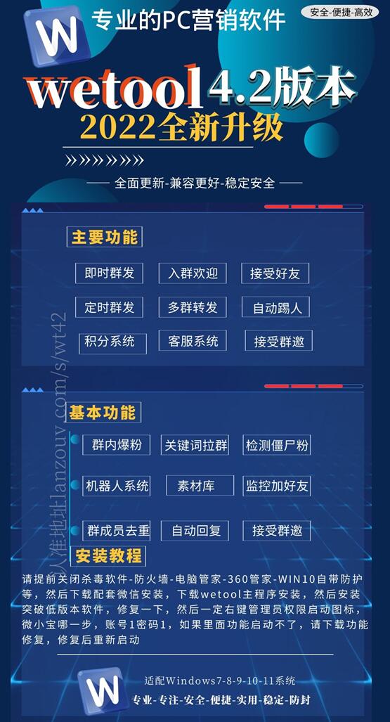 wetool4.2新版是一款功能实用的微信辅助工具。这款软件可以帮助用户提供对好友0打扰的僵尸粉检测清理功能,亦支持消息群发、批量加群好友,为帐号管理、资讯发布提供高效协助。另外还支持,支持自动踢人、引流辅助、丰富强悍等功能。wetool可以让您对微信管理或者微信营销更加的便捷。一款高效免费的微信管理工具,对于许多用微信做运营的朋友,这可是一个不错的引流工具。喜欢的朋友快来下载吧。